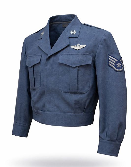 Origineel US Air Force dienstjasje uit de Koude Oorlog, uitgevoerd in klassiek luchtmachtblauw en voorzien van authentieke insignes. Dit jasje werd gedragen door een Staff Sergeant (E-5), herkenbaar aan de mouwemblemen met ster en chevrons. Op de borst bevindt zich een originele USAF wings badge, wat duidt op vliegend of luchtvaartgerelateerd personeel. De kraag is afgewerkt met metalen “US” collar discs, volledig correct voor de periode.