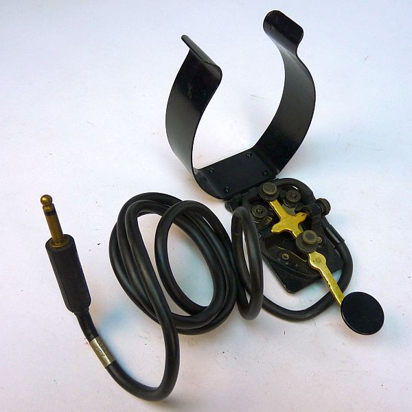 Unieke en zeldzame been-gemonteerde morsesleutel, ontworpen voor gebruik door radio-operators in het veld of in voertuigen en vliegtuigen. Deze zogenaamde “leg key” wordt met de metalen band aan het been bevestigd, waardoor stabiel seinen mogelijk is terwijl de operator mobiel blijft.