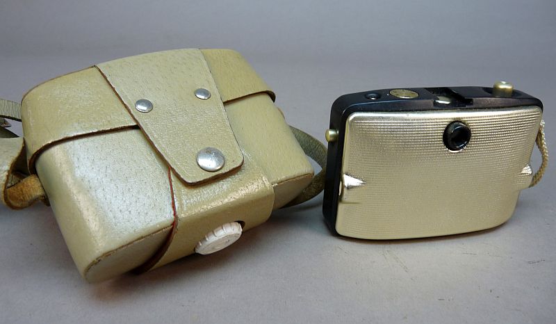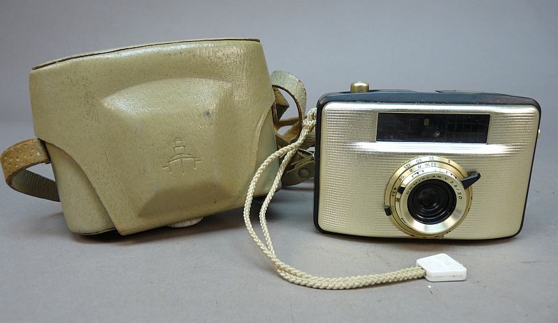 Bijzondere en compacte vintage camera uit de DDR, uitgevoerd in een stijlvolle lichtgekleurde behuizing met goudkleurige accenten. Een echte eyecatcher en geliefd bij verzamelaars van Oostblok camera’s.