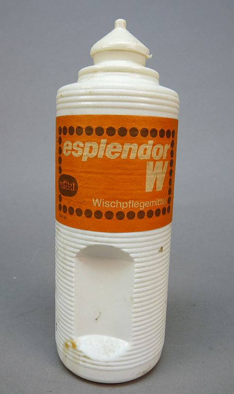 Originele fles vloeronderhoudsmiddel uit de voormalige DDR (Oost-Duitsland). Dit product, “esplendor W”, werd gebruikt als dweil- en onderhoudsmiddel voor vloeren en geeft een mooie inkijk in huishoudelijke producten uit de socialistische periode.
