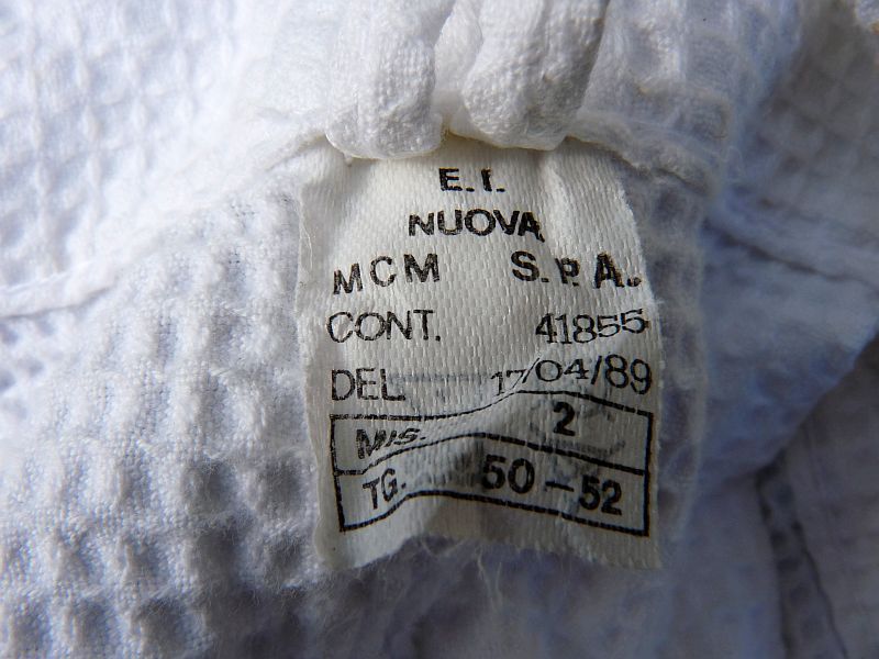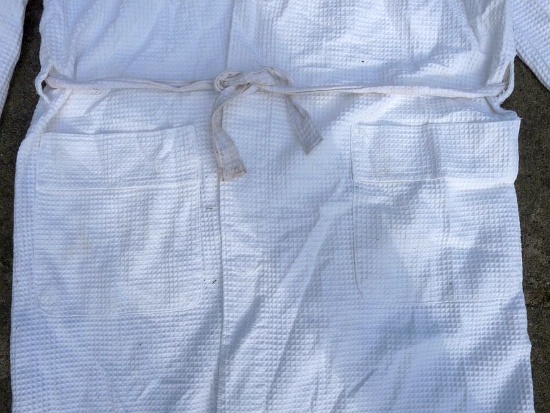 Authentieke vintage badjas afkomstig uit een militair hospitaal, geproduceerd in de jaren 80. Deze badjas is gemaakt van stevig katoen met een lichte wafelstructuur, waardoor de stof ademend, comfortabel en duurzaam is. Dergelijke badjassen werden gebruikt in militaire ziekenhuizen en militaire medische instellingen vanwege hun praktische en hygiënische eigenschappen.