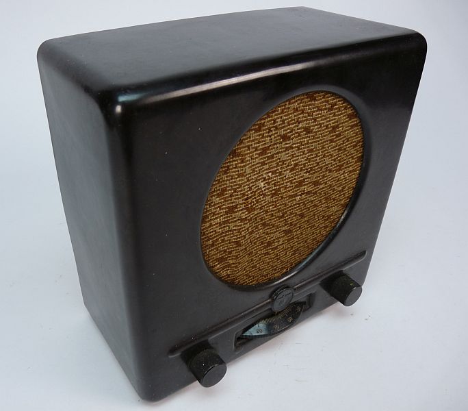 Deze originele Wega GW110 volksontvanger is een karakteristieke vintage radio uit de periode 1937-1945. Het compacte ontwerp met strakke bakelieten behuizing en ronde luidsprekeropening geeft het toestel een tijdloze, industriële uitstraling die perfect past in een retro interieur of verzameling.