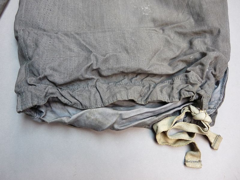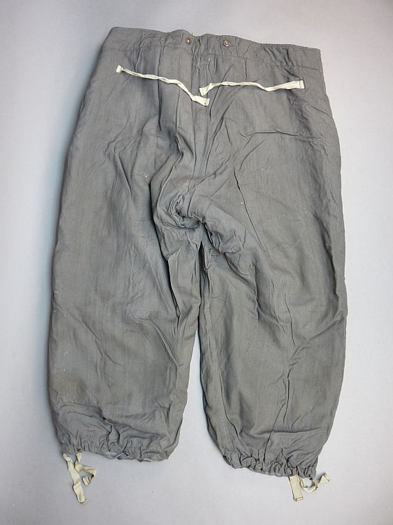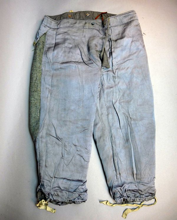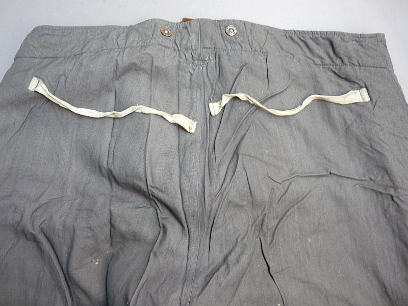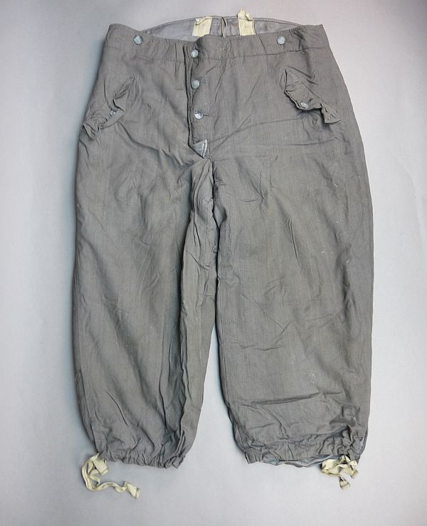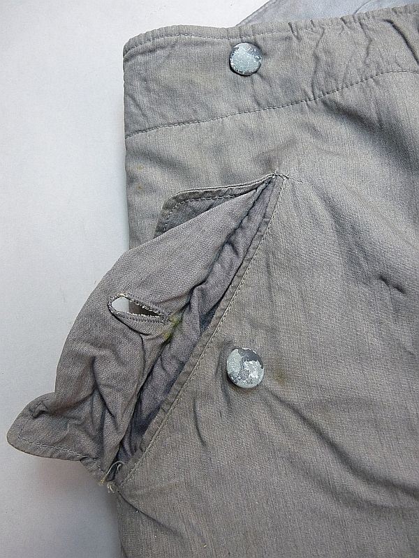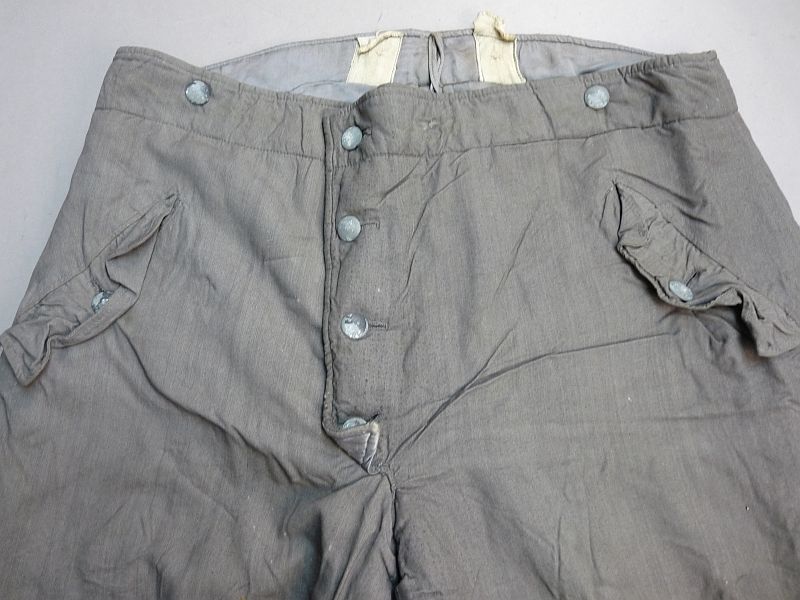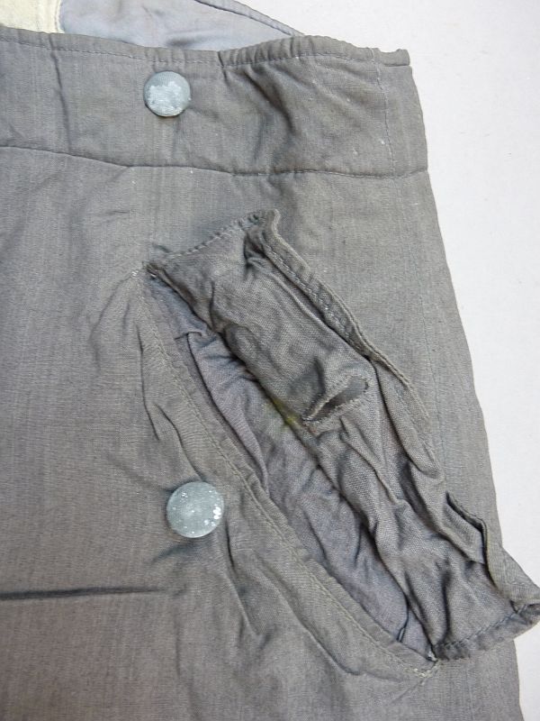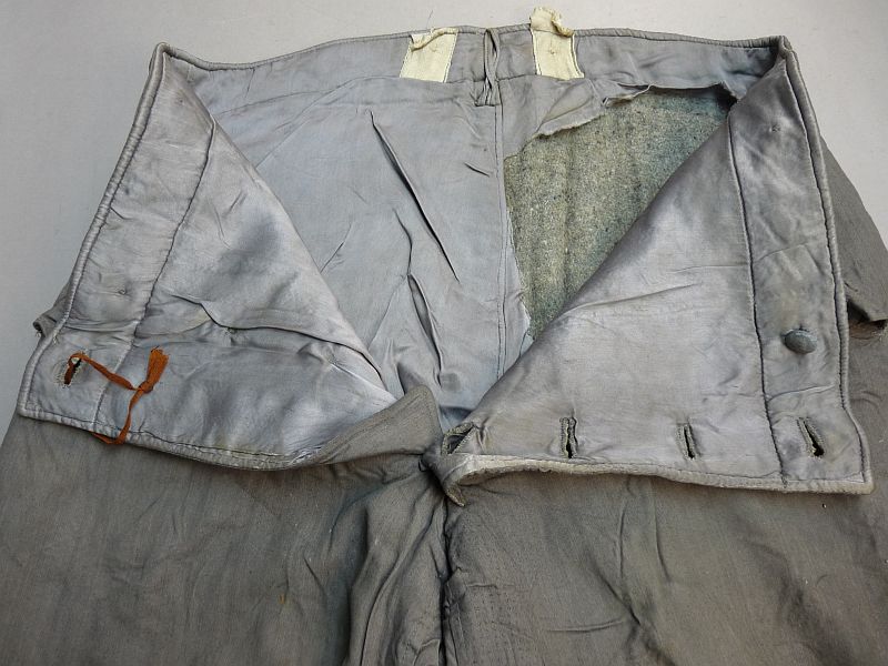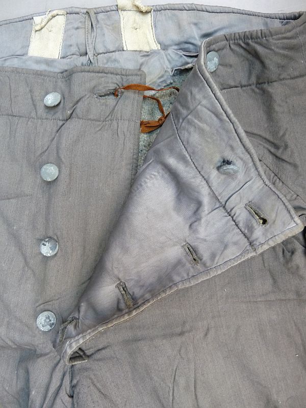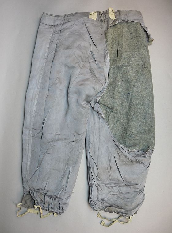 Originele Tweede Wereldoorlog Luftwaffe winterbroek, uitgevoerd in grijsgroene stof. Het betreft een gevoerde broek, ontworpen voor gebruik in koude omstandigheden, met een dikke wollen/padding voering die deels zichtbaar is aan de binnenzijde.