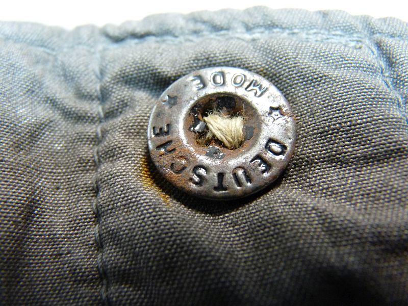 De broek is voorzien van een knoopsluiting aan de voorzijde met meerdere originele knopen, evenals knoopsluitingen op de zakken. Op de tailleband zitten metalen knopen, waaronder exemplaren gemarkeerd met “D.R.P. / Deutsche Mode”, wat typerend is voor Duitse productie uit die periode.
